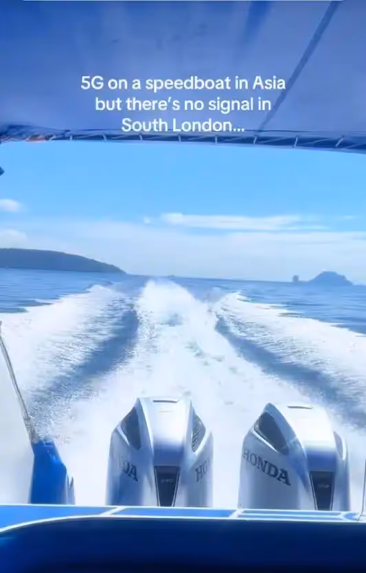 视频里,小伙正坐在快艇上出海。按常识,海上信号能有4G就不错了,结果镜头一转:5G满格,刷视频、加载页面一气呵成。他当场对比起老家,在画面上调侃一句:“在亚洲坐快艇都有5G,可在伦敦南部,手机只剩下转圈圈……”
