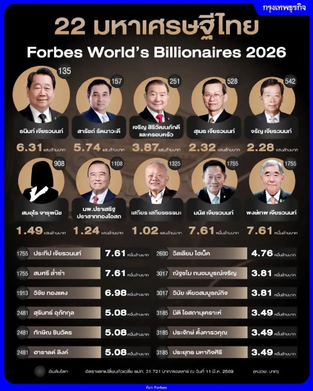 福布斯2026富豪榜出炉,泰国22位富豪上榜