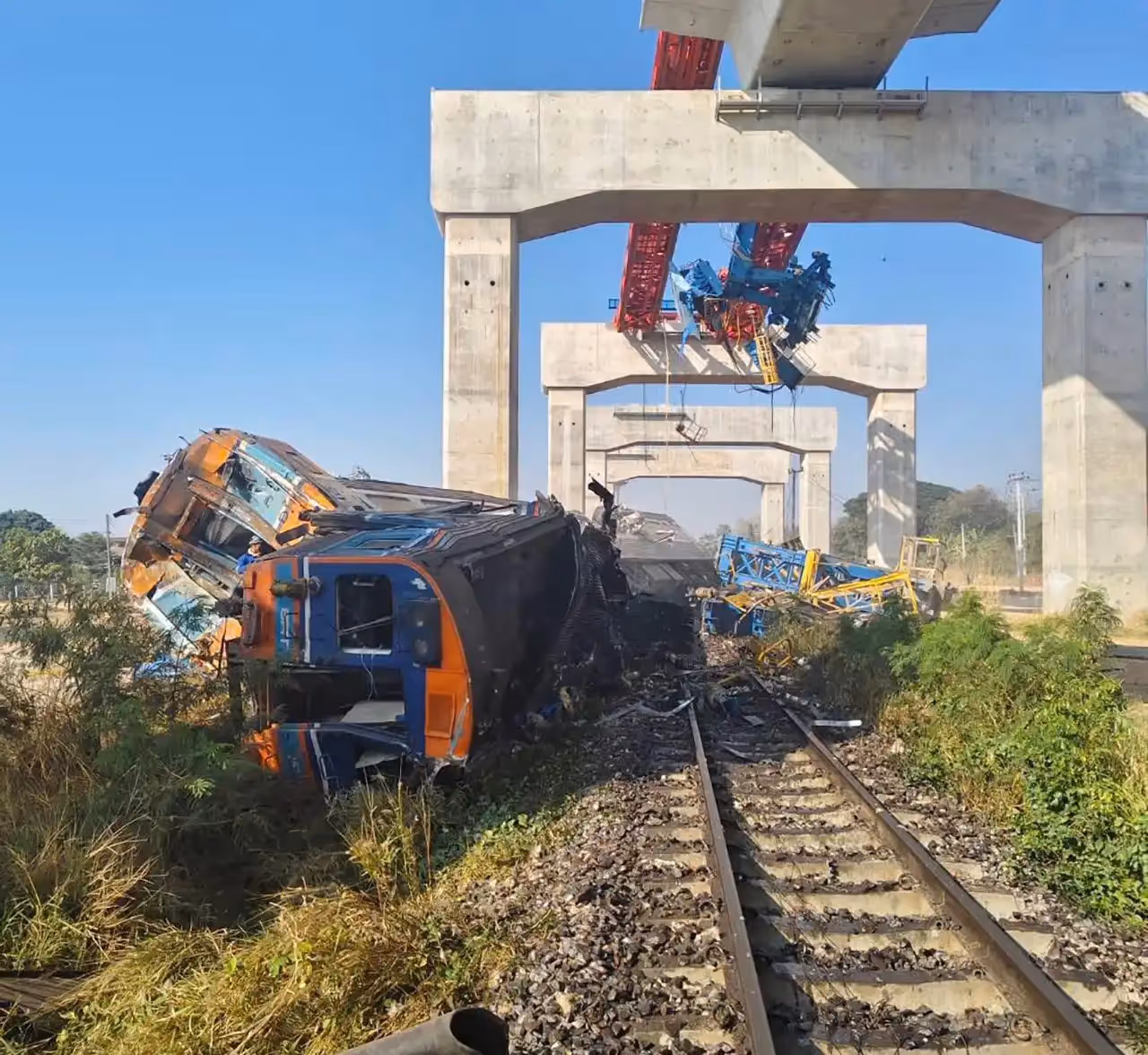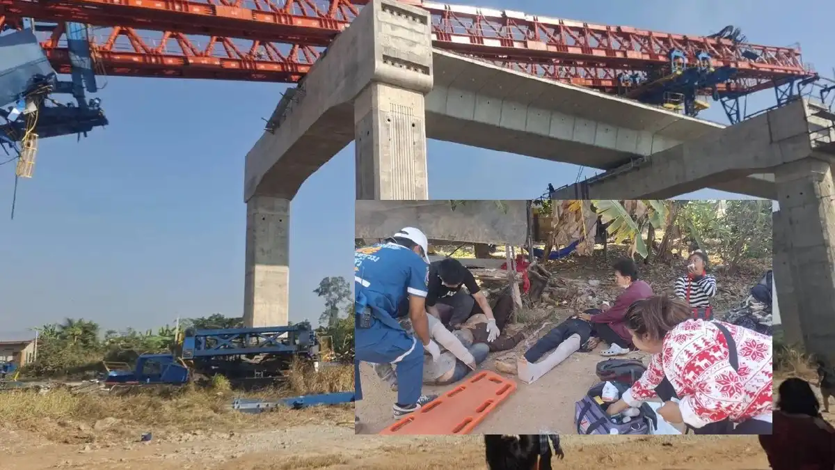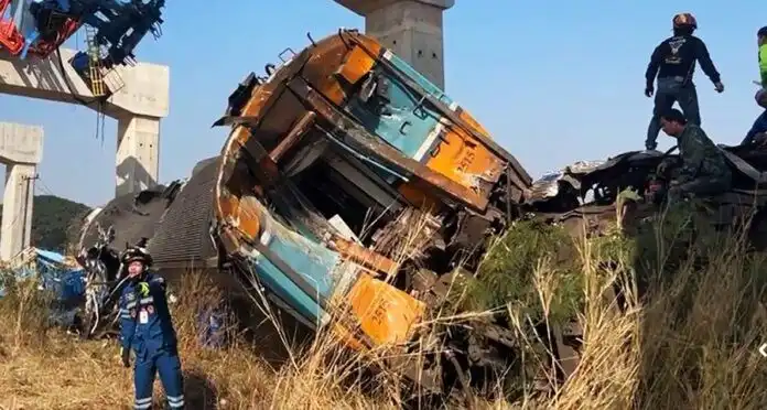 当时,一台正在立交桥上作业的高铁项目施工起重机,从约9米高空失控坠落,正好砸中驶入色基火车站的第21次柴油特快列车。该列车由曼谷阿披瓦中央车站发车,开往乌汶府。
