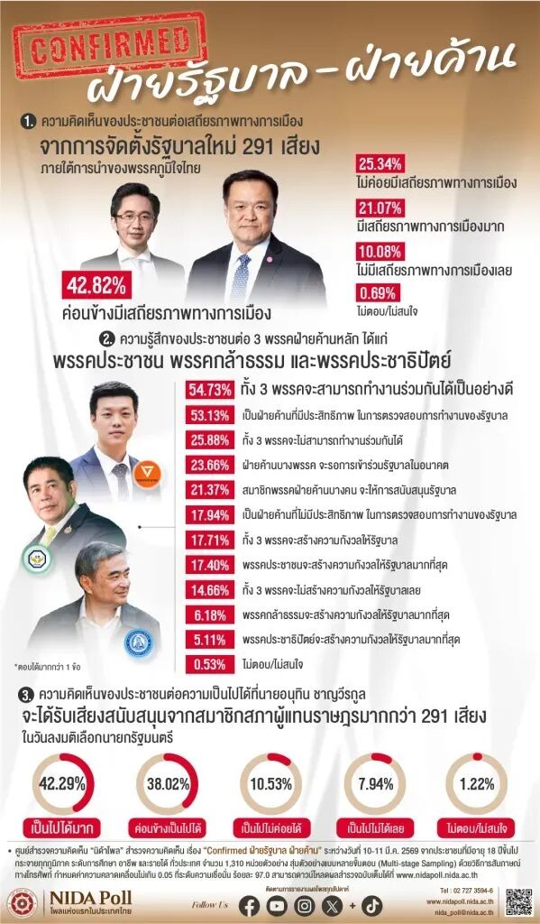 泰国国家发展管理学院(NIDA Poll)在3月10-11日进行的一项民调显示,社会对这届政府的稳定性评价呈现出一种微妙的“谨慎乐观”。