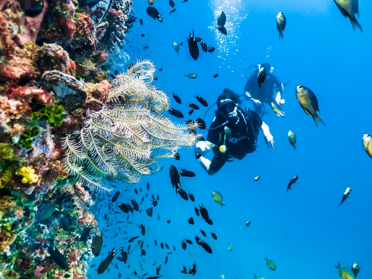 透过浅绿的海水,可以看见成群结队的小鱼甚至“鱼群风暴”。海底的岩石上还长着一众五颜六色的珊瑚,有的像绽开的花朵,有的像分枝的鹿角。在如此梦幻的海底世界里穿梭的你,仿佛也变成了一条小鱼,看见了世界的另外一面。