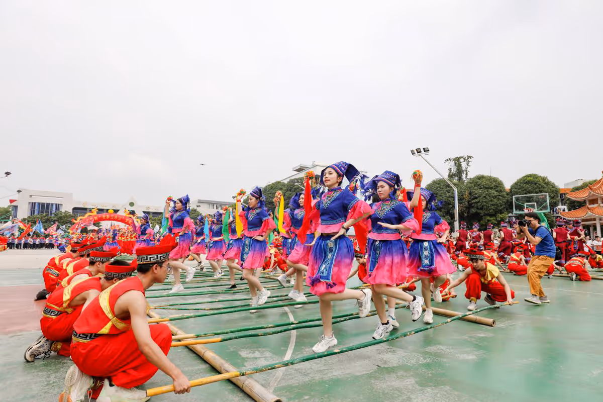 抛绣球、斗彩蛋、千人共跳牛牛舞、跳竹竿舞、打陀螺、高跷竞速、板鞋竞速……壮族人民将民俗与运动相结合的项目丰富多彩,让这春日里的壮乡土地处处显露勃勃生机。