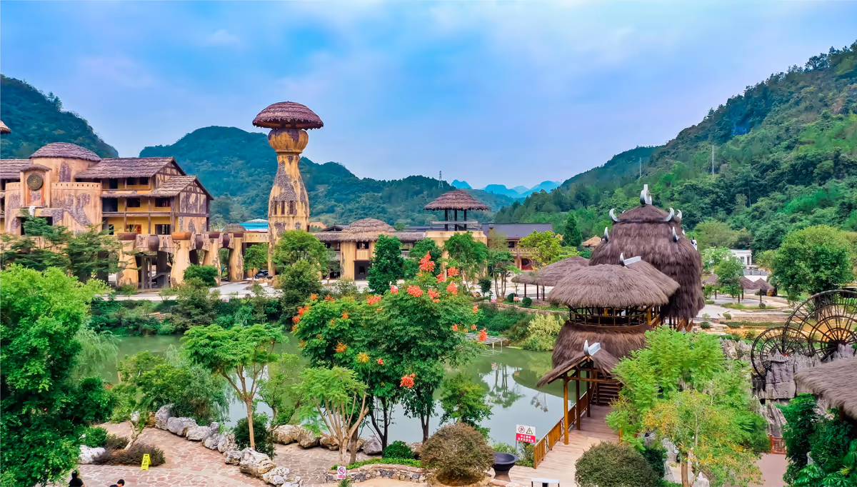 歌娅思谷景区的建筑给人一种久远的感觉,尽量还原出原始淳朴感。整体按“一点、一线、九个区”建设,即一点:洞天古韵——白裤瑶民族文化展演基地;一线:地下大峡谷——岩溶地质博物馆;九区则是结合了精品酒店、餐饮 服务、农耕体 验、民俗工艺展示、民族餐饮服务、农耕体验、民俗工艺展示、民族体育竞技、细话歌园、生态养殖、戏水、农特综合开发区等。踏上这里的那刻便能感受到浓郁的民族风情,享受最原始的浪漫。而作为歌娅思谷景区的重要组成部分,瑶望天下景区中的民俗旅游活动更是进一步将白裤瑶神秘的铜鼓文化、服饰文化、歌谣文化等一一展现,是最集中可以看到白裤瑶民俗文化生动传承的地方。