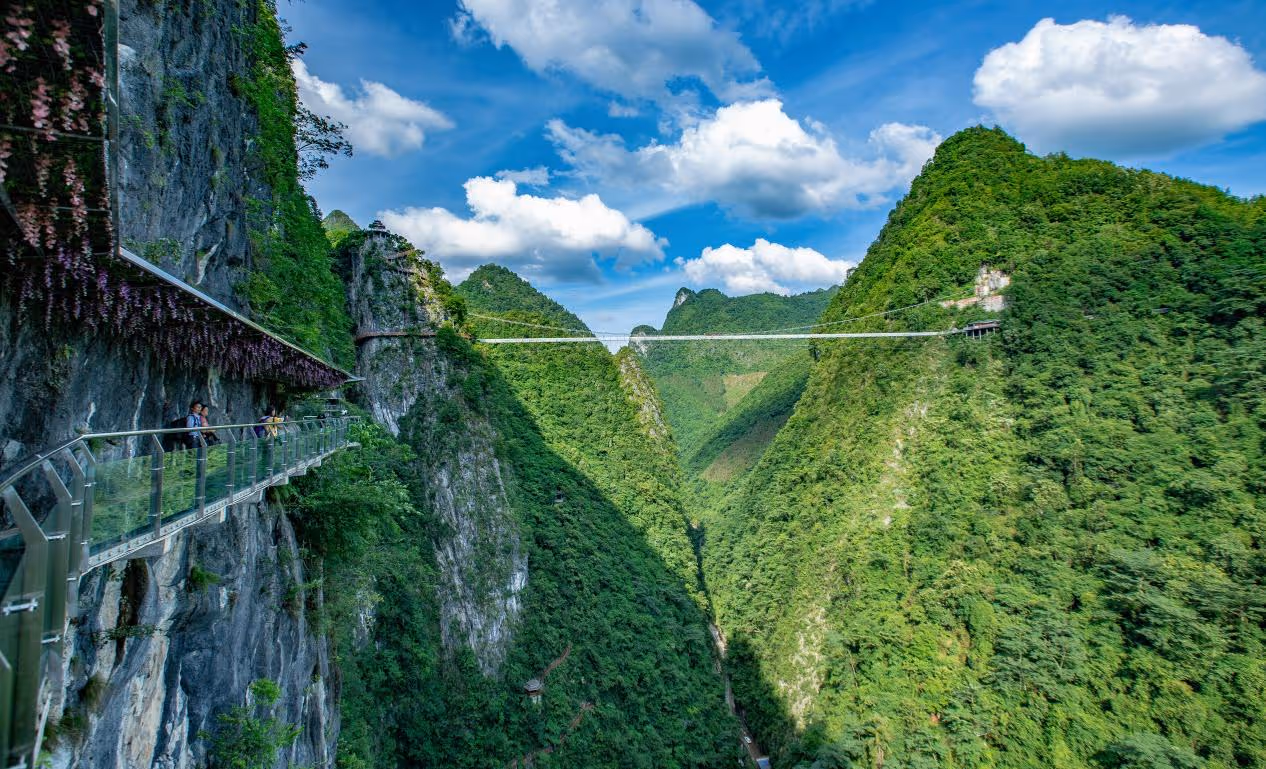在这绝美的山间,有一条玻璃栈道,这是目前广西垂直高度第一,中国国内单体最长的玻璃栈道。无论在踏上桥面前做了多少的心理准备,但在真正站上去的那一瞬间,可能还是免不了要对这离地面垂直高度达 180 米的透明平台产生一丝恐惧。走在玻璃栈道上,是对胆量的考验,也是从另一个角度感受丹炉山的绝佳方式。透明的栈道将整个人承托着,将人置于景中,丹炉山景区和其周遭的景色尽收眼底,给人一种犹如悬在空中的观景体验。