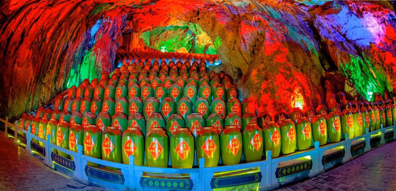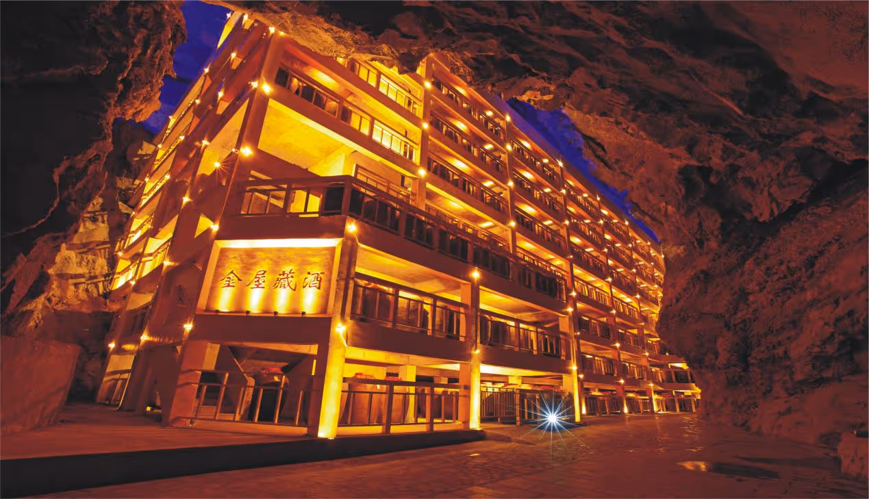 这座融合喀斯特地形与酒文化的天然藏酒博物馆中,处处散发着迷人酒香。藏酒洞内常年温度在 16°C~17°C,湿度保持在 80%~95%,是绝佳的保存美酒的温湿度条件,也是盛夏避暑的良地。巨大的溶洞内可存放约 5 万吨的美酒,而绝佳的保存条件也让洞内空气中的酒精不易扩散,绵绵的酒香挥之不去。让整个溶洞内处处飘满酒香,人走到一半,就闻醉了,如同一个大型的“洞穴酒吧”。
