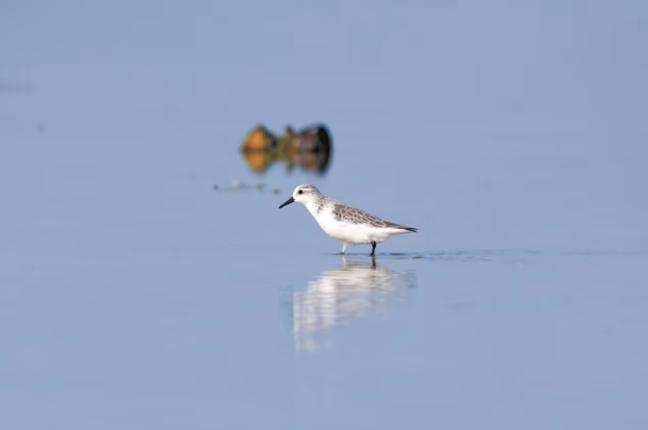 据说,地球上生活着近一万种鸟,40% 以 上具有迁徙的习惯,而迁徙过程险象环生,是候鸟死亡率最高的时期。经历长途飞行后在三娘湾沿岸滩涂上停歇整顿,是鸟儿最放松的时候。为了不惊动它们,最好穿着浅色系的衣服。远远看去,候鸟的样貌无外乎一个个蓬松的小团子,但透过摄影机或望远镜,可以看到多数鸟儿有着因长于飞行而清劲有力的骨骼,让长年“蜗居”在办公椅上的新人类不免心生艳羡。