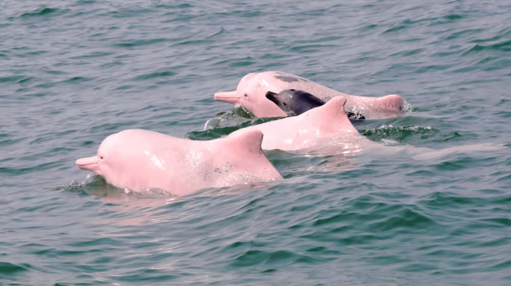 中华白海豚属于鲸类的海豚科,是宽吻海豚及虎鲸的近亲。它们和人类一样恒温,用肺部呼吸、怀胎产子并亲自哺育幼儿。虽然叫“白海豚”,但它们不白,且一生里会随着年龄变色,刚出生的白海豚呈深灰色,青年时呈灰色,成年后则呈粉红色。它们也十分通晓“人性”,性情活跃,时常3~5只成群,追逐在货船、渔船身侧,偶尔从金光粼粼的海面上向着日出日落的方向鱼跃而出,又在人们的欢呼和掌声里变换着丰富的队形,大方的模样十分惹人喜爱。