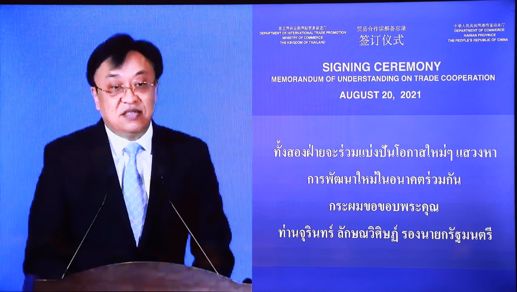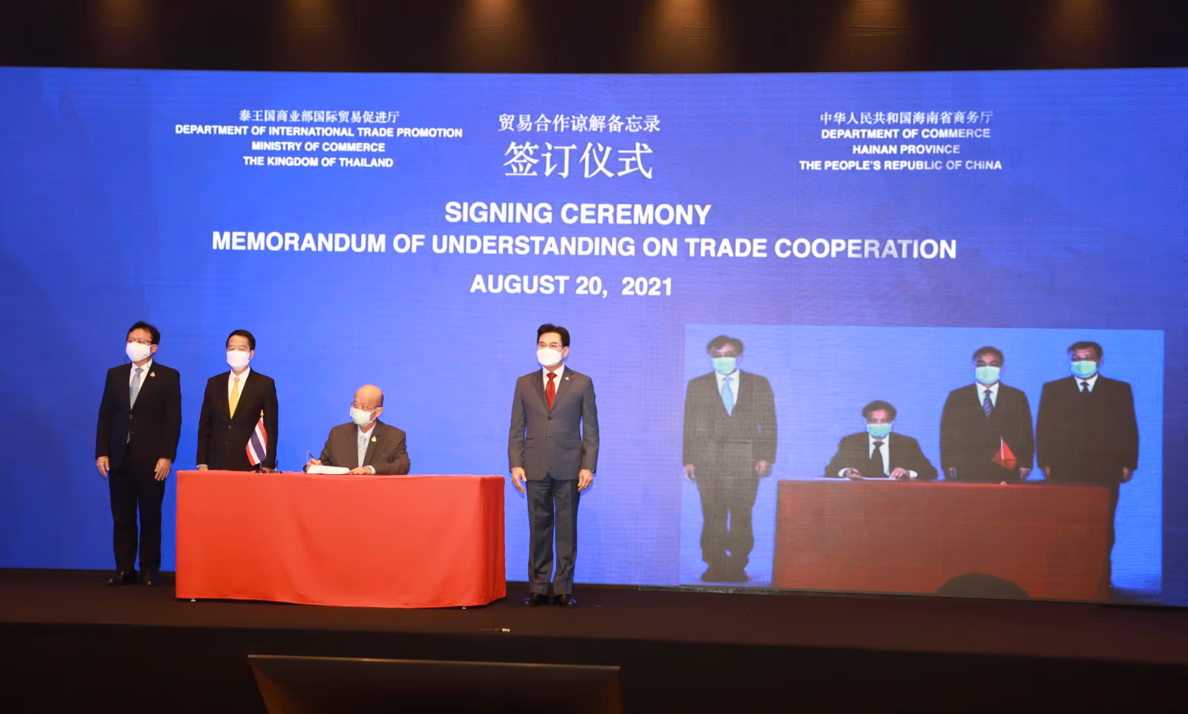 随着中国政府宣布将海南全面建成具有较强国际影响力的高水平自由贸易港,当今海南已发生了翻天覆地的变化。基于海南释放的潜力,2021年8月20日,在泰国副总理兼商务部部长朱林和中国海南省省长冯飞的见证下,泰国商务部国际贸易促进厅与海南省商务厅举行了贸易合作谅解备忘录线上签订仪式。