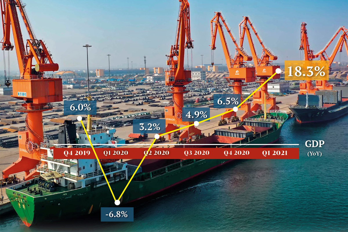 面对突如其来的疫情天灾,中国实施封锁措施。在此环境下,2020年一季度中国GDP出现了“6.8%的缩减”。一转眼来到2021年一季度,中国经济交出亮眼“成绩单”,GDP同比增长18.3%,是29年来单季GDP同比增长的最高水平。