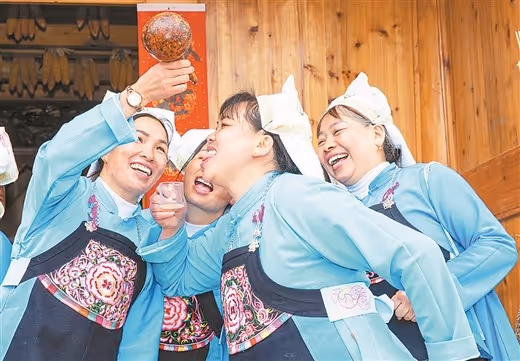 19、4月3日,广西天峨县三堡乡的蓝衣壮妇女们唱山歌、斗美酒,欢度“壮族三月三”。 广西日报记者 廖庆凌 通讯员 王明福/摄