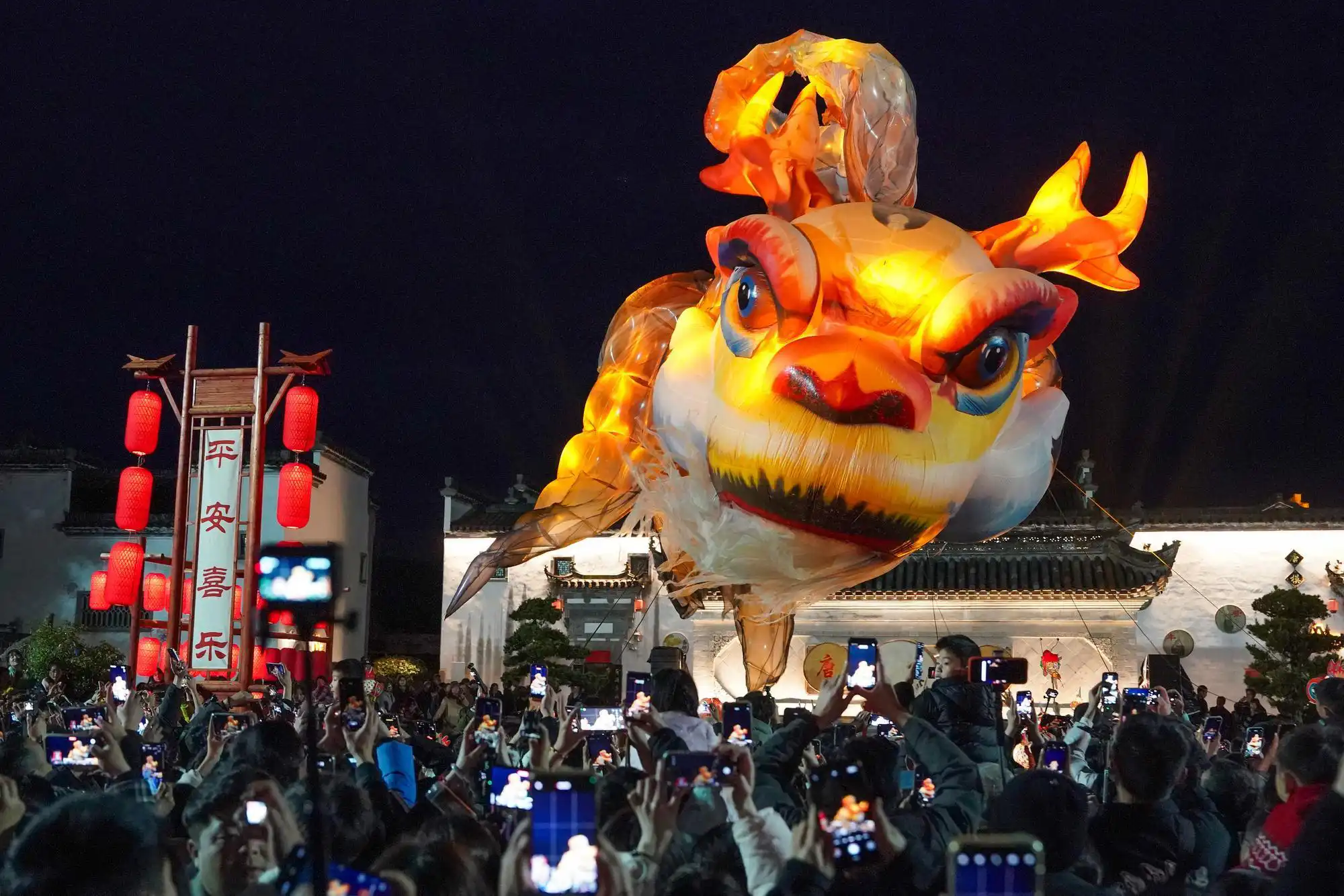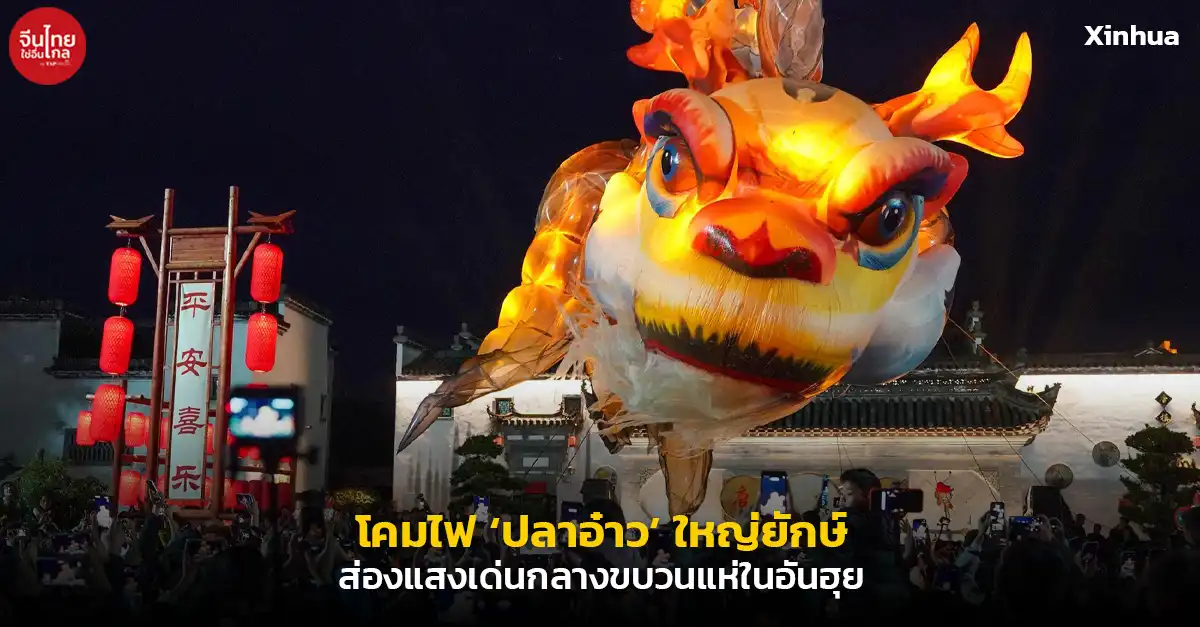 ผู้คนเนืองแน่นแห่ชมความยิ่งใหญ่ตระการตาของขบวนแห่โคมไฟ “ปลาอ๋าว” ส่องแสงเรืองรองกลางค่ำคืนที่เมืองโบราณถังโม๋ เมืองหวงซาน มณฑลอันฮุยทางตะวันออกของจีน โดยโคมไฟรูปปลาอ๋าวขนาดมหึมา ซึ่งเป็นสัตว์ในตำนานของจีนที่มีหัวเป็นมังกรและลำตัวเป็นปลา เปล่งประกายสีส้มทองลอยเด่นเหนือฝูงชน ท่ามกลางแสงโคมแดงที่ประดับเรียงราย สร้างบรรยากาศคึกคักและงดงามต้อนรับเทศกาลโคมไฟที่กำลังจะมาถึงอย่างอลังการ