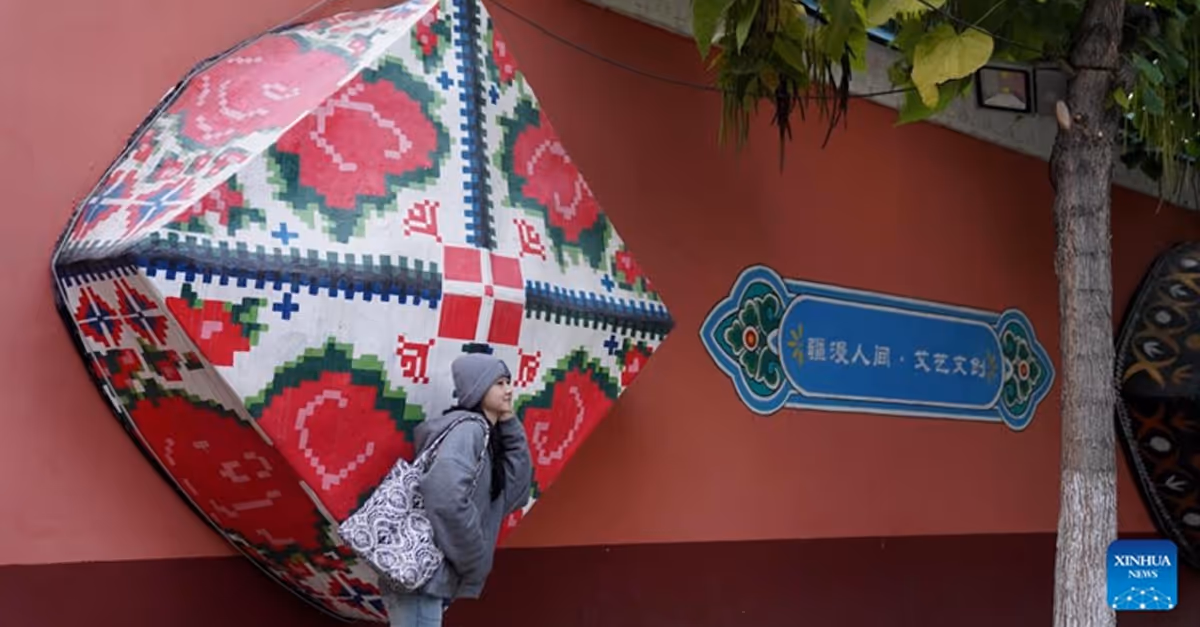 ผู้หญิงคนหนึ่งโพสท่าถ่ายรูปบนถนนลิ่วซิงอันเก่าแก่ในเมืองอีหนิง แคว้นปกครองตนเองอีหลี กลุ่มชาติพันธุ์คาซัค เขตปกครองตนเองซินเจียงอุยกูร์ทางตะวันตกเฉียงเหนือของจีน วันที่ 27 กันยายน 2024 (สำนักข่าวซินหัว/จ้าว หยู่ซือ)