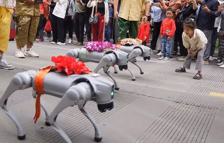กลุ่มหุ่นยนต์สุนัขอัจฉริยะทั้งแปดตัวที่มาพร้อมพวงดอกไม้สีสันสดใสสะดุดตากลายเป็น "ดาวเด่น" ที่ดึงดูดความสนใจจากผู้คนจำนวนมาก ซึ่งตื่นตาตื่นใจกับการเต้นตามเสียงเพลงของหุ่นยนต์เหล่านี้และประทับใจกับการผสมผสานเทศกาลดั้งเดิมเข้ากับเทคโนโลยีสมัยใหม่