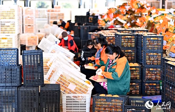 เมื่อเร็วๆ นี้ภายในบริษัทการเกษตรสมัยใหม่แห่งหนึ่งในตำบลเชอโถว อำเภออันหย่วน เมืองก้านโจว มณฑลเจียงซีทางตะวันออกของจีนคนงานกำลังเร่งคัดแยกและบรรจุส้มนาเวล ขณะที่เครื่องจักรอัตโนมัติทำงานต่อเนื่องด้วยความเร็วสูง