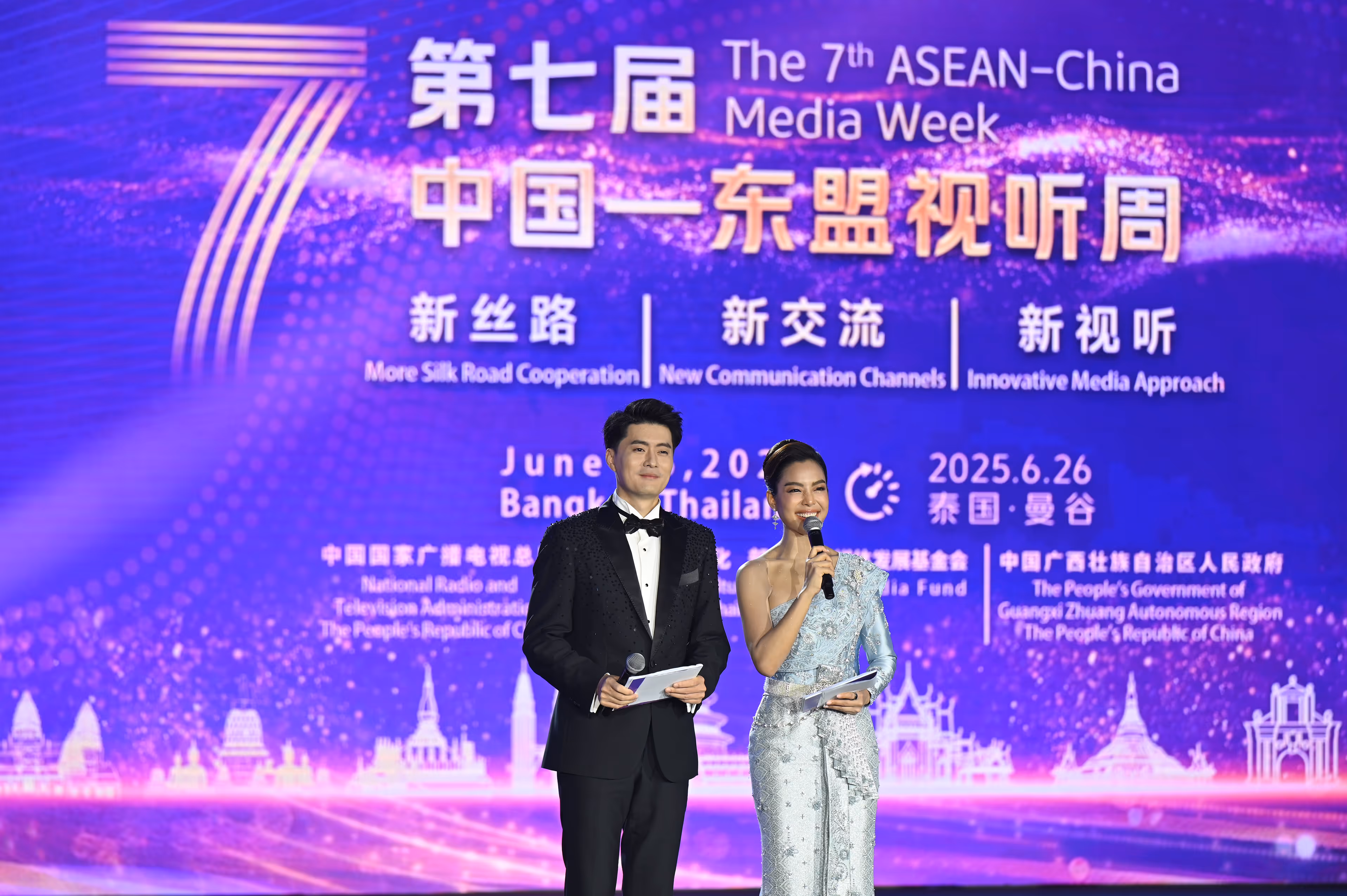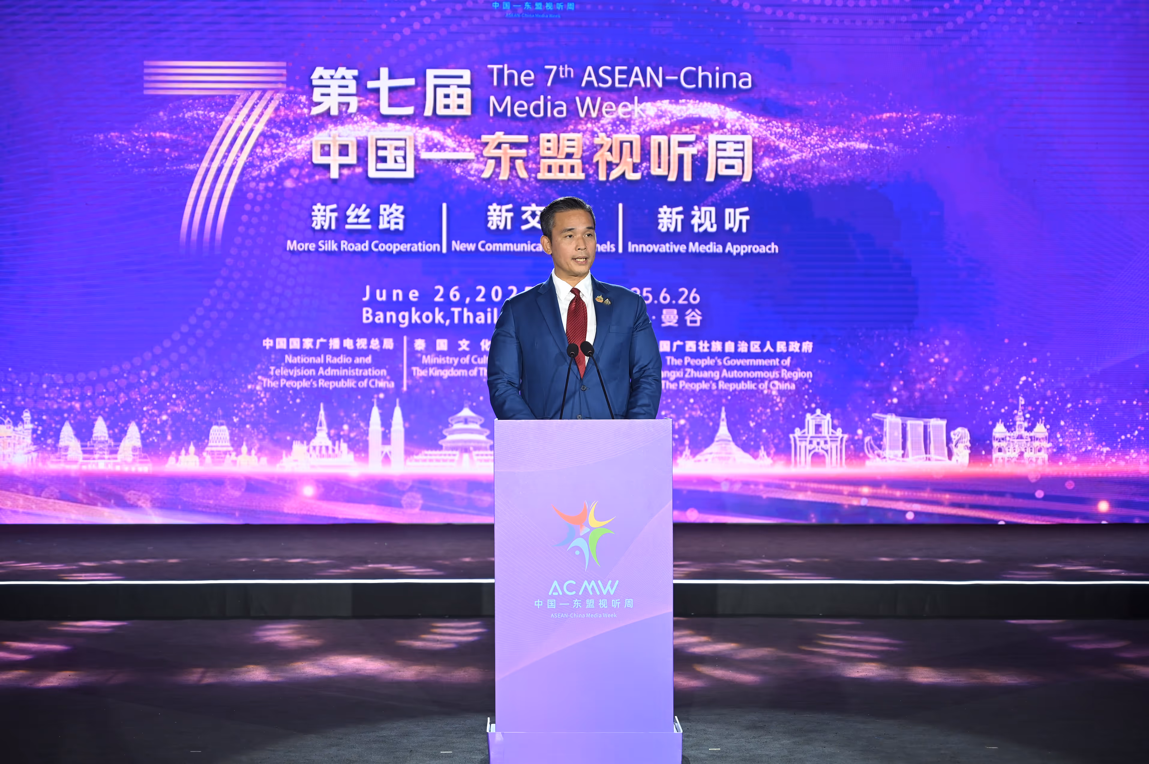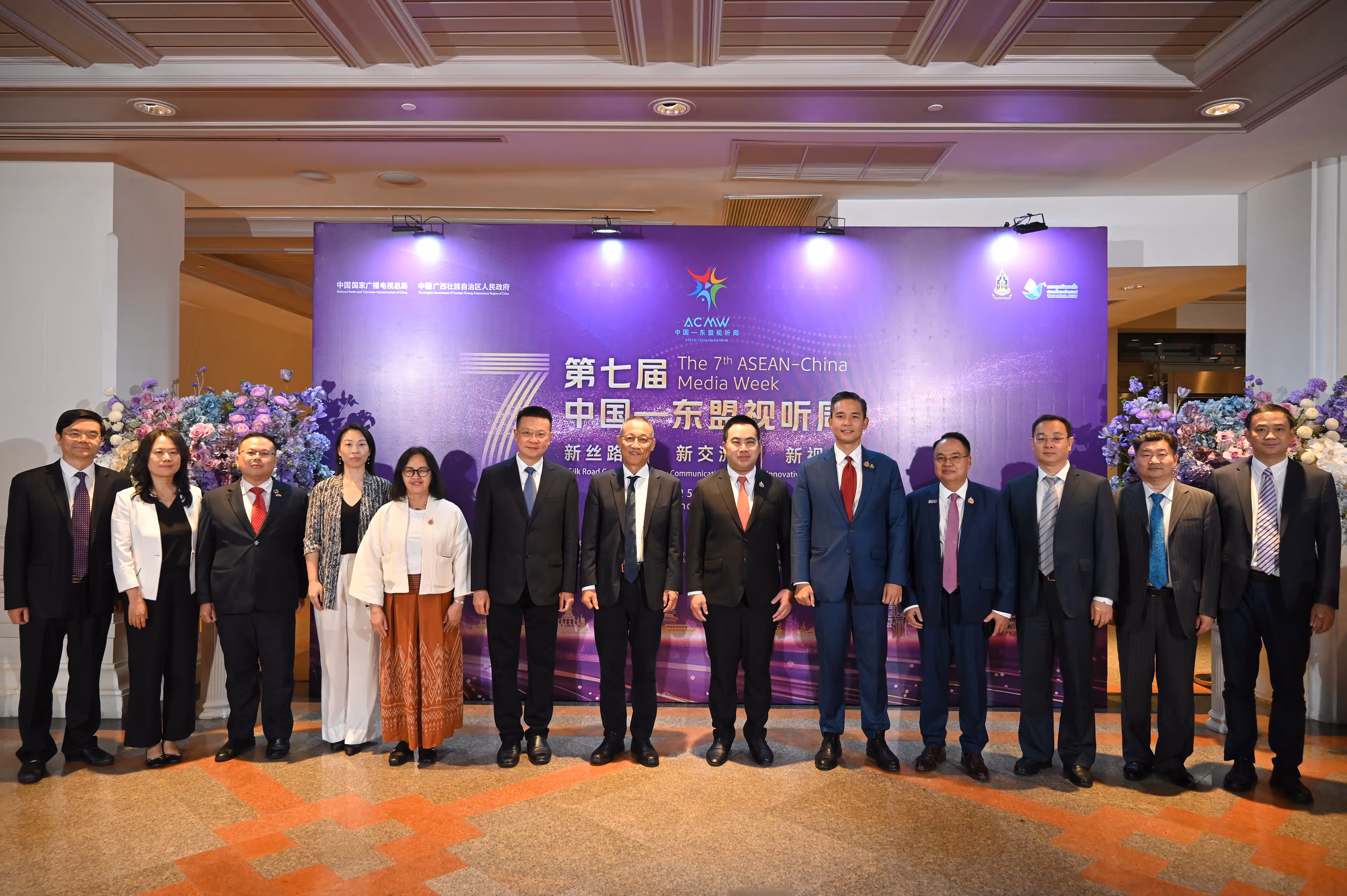 งานสัปดาห์สื่ออาเซียน-จีนครั้งที่ 7 (The 7thASEAN-China Media Week) ภายใต้หัวข้อ“มุ่งสร้างเส้นทางสายไหมยุคใหม่ ผ่านความร่วมมือสื่อสร้างสรรค์” (More SilkRoad Cooperation, New Chapter Communication, Innovative Media Approach) จัดโดย สำนักงานวิทยุและโทรทัศน์แห่งชาติจีน (NRTA),รัฐบาลเขตปกครองตนเองกว่างซีจ้วง สาธารณรัฐประชาชนจีนกระทรวงวัฒนธรรม และกองทุนพัฒนาสื่อปลอดภัยและสร้างสรรค์ ในวาระครบรอบ 50 ปีแห่งการสถาปนาความสัมพันธ์ทางการทูตระหว่างประเทศไทยและสาธารณรัฐประชาชนจีนหรือ “ปีทองแห่งมิตรภาพไทย–จีน” ระหว่างวันที่ 26 มิถุนายน -3 กรกฎาคม 2568 ณ กรุงเทพฯ โดยได้รับเกียรติจาก นายพลภูมิ วิภัติภูมิประเทศผู้ช่วยรัฐมนตรีประจำกระทรวงวัฒนธรรม เป็นผู้แทนนายกรัฐมนตรีและรัฐมนตรีว่าการกระทรวงวัฒนธรรม เป็นประธานเปิดงาน ร่วมด้วย นายต่ง ซิน (Mr.DongXin)รองผู้อำนวยการสำนักงานวิทยุและโทรทัศน์แห่งชาติจีน นายหู ฟาน (Mr.HuFan) รองประธานเขตปกครองตนเองกว่างซีจ้วง นายศึกษิษฏ์ศรีจอมขวัญ รองเลขาธิการนายกรัฐมนตรี นางรักชนก โคจรานนท์ รองปลัดกระทรวงวัฒนธรรมและดร.ธนกร ศรีสุขใส ผู้จัดการกองทุนพัฒนาสื่อปลอดภัยและสร้างสรรค์ พร้อมแขกผู้มีเกียรติและสื่อมวลชนจากประเทศไทยและสาธารณรัฐประชาชนจีน เข้าร่วมงานอย่างคับคั่ง เมื่อวันที่ 26 มิถุนายน 2568 ณ หอประชุมกองทัพเรือ กรุงเทพมหานคร