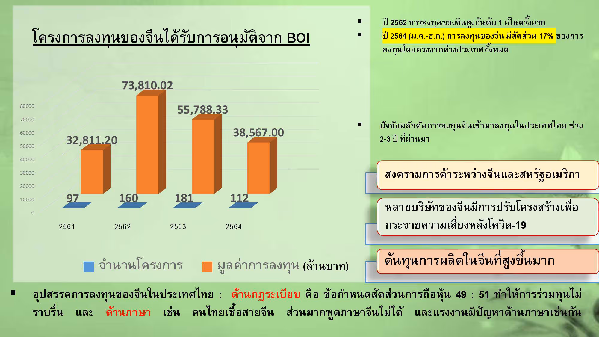 ทั้งนี้ ในปี 2564 การลงทุนของจีนมีสัดส่วน 17% ของการลงทุนโดยตรงจากต่างประเทศทั้งหมด โดยมีการเข้ามาลงทุนในหลากหลายอุตสาหกรรม อาทิ อุตสาหกรรมการเกษตร, อุตสาหกรรมเบาและสิ่งทอ, ผลิตภัณฑ์โลหะและเครื่องจักร, เครื่องใช้ไฟฟ้าและผลิตภัณฑ์อิเล็กทรอนิกส์, อุตสาหกรรมบริการต่าง ๆ, เคมีภัณฑ์และกระดาษ ฯลฯ โดยปัจจัยที่ผลักดันให้จีนเข้ามาลงทุนในประเทศไทยในช่วง 2-3 ปี ที่ผ่านมา ได้แก่ สงครามการค้าระหว่างจีนและสหรัฐอเมริกา ประกอบกับหลายบริษัทของจีนมีการปรับโครงสร้างเพื่อกระจายความเสี่ยงหลังโควิด-19 รวมถึงต้นทุนการผลิตในจีนที่เพิ่มสูงขึ้นมาก