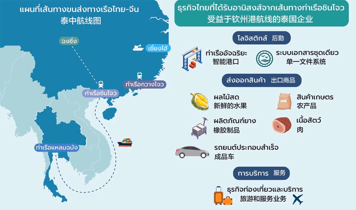 “ปัจจุบัน ท่าเรือชินโจวมีศักยภาพความพร้อม ในฐานะจุดเชื่อมต่อของระเบียงการค้าระหว่างประเทศเชื่อมทางบกกับทางทะเลสายใหม่ ทั้งในด้านการเป็นท่าเทียบเรืออัจฉริยะ มีโครงสร้างพื้นฐานที่ทันสมัย มีฟังก์ชั่นรองรับการขนส่งต่อเนื่องหลายรูปแบบ ไม่ว่าจะเป็นโมเดลการขนส่งแบบ ‘เรือ+ราง’ เป็นแห่งแรกในจีนที่เชื่อมต่อกับโครงข่าย China - Europe Railway ทำให้ผู้ประกอบการสามารถลำเลียงสินค้าไทยไปขยายตลาดในเอเชียกลางและยุโรปได้ด้วย นอกจากนี้ ท่าเรือชินโจวยังได้ลงนามข้อตกลงท่าเรือพี่น้องกับท่าเรือแหลมฉบังมาตั้งแต่ปี 2561 ซึ่งเป็นกลไกพื้นฐานที่สำคัญในการขยายความร่วมมือทางท่าเรือระหว่างไทยกับจีน”