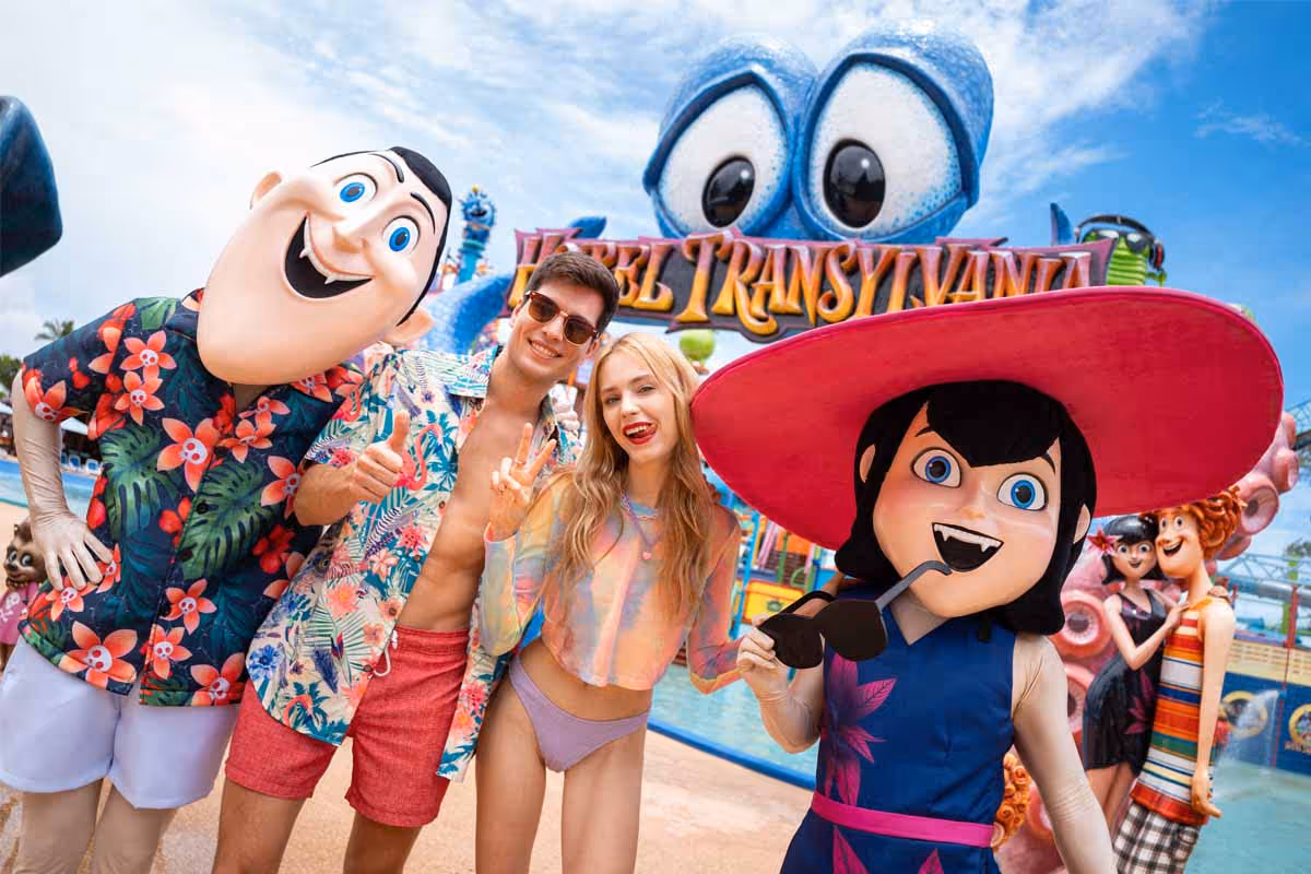 โซนแรกในธีมพาร์คที่เราจะได้พบ คือ โฮเทล ทรานซิลเวเนีย (Hotel Transylvania) บอกเลยว่าน่ารักมาก เพราะจะได้เจอกับเหล่าตัวละครจาก ‘โรงแรมผีหนี ไปพักร้อน’ นำโดย ‘แดรค เมวิส บล็อบบี้’ ที่ยกขบวนมาต้อนรับ ใครจะถ่ายรูปกับตัวละคร เล่นน้ำชิล ๆ หรือชอบตื่นเต้นเเบบในหนังก็มีให้ลุย เพราะสวนน้ำที่นี่มีสไลเดอร์ถึง 9 ตัว ใหญ่ที่สุดในเอเชียตะวันออกเฉียงใต้เลยก็ว่าได้ พร้อมเครื่องเล่นกว่า 100 อย่าง อาทิ จรวดน้ำ ถังสแปลชบัคเก็ตยักษ์ และอื่น ๆ อีกมากมาย