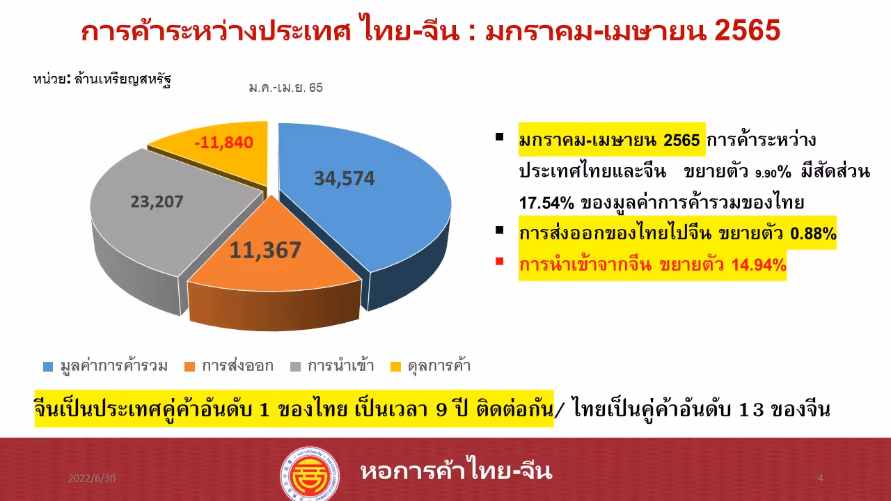 กล่าวคือ ร้อยละ 54 คาดว่าการส่งออกของไทยไปยังจีนจะเพิ่มขึ้น และ ร้อยละ 27 ยังไม่เปลี่ยนแปลงไปจากปัจจุบัน ด้านการคาดคะเนการนำเข้านั้น ร้อยละ 58 คาดว่าการนำเข้าจากจีนจะเพิ่มสูงขึ้น และร้อยละ 23 การนำเข้าจะทรงตัว