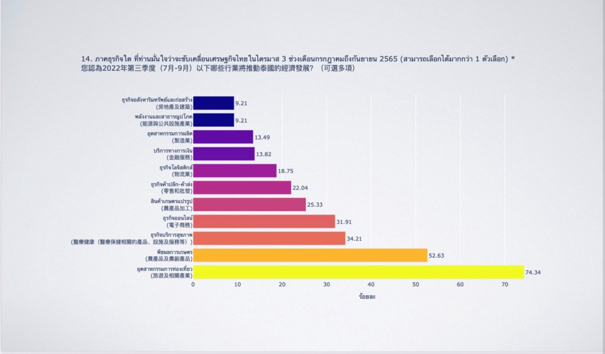 ทั้งนี้ ภาคธุรกิจที่ยังสามารถขับเคลื่อนเศรษฐกิจไทยในไตรมาสหน้าคือ ธุรกิจการท่องเที่ยว พืชผลการเกษตร ธุรกิจบริการสุขภาพ และธุรกิจออนไลน์ ส่วนธุรกิจที่ต้องได้รับการแก้ไขอย่างเร่งด่วนคือ ธุรกิจการท่องเที่ยว พืชผลการเกษตร และพลังงานและสาธารณูปโภค โดยจากการสอบถามเพิ่มเติมในส่วนของอุตสาหกรรมการท่องเที่ยวพบว่า เป็นอุตสาหกรรมที่เป็นโอกาสของประเทศไทยที่สำคัญ และจะนำไปสู่การฟื้นตัวของเศรษฐกิจได้หากได้รับการแก้ไขอุปสรรคอย่างรวดเร็ว