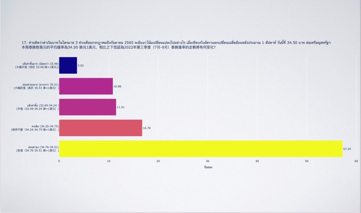 ส่วนแนวโน้มอัตราแลกเปลี่ยนในไตรมาสหน้านั้น เสียงส่วนใหญ่ร้อยละ 57 คาดว่าเงินบาทจะมีค่าอ่อนลงเมื่อเทียบกับดอลลาร์สหรัฐอเมริกา และอีกร้อยละ 17 คาดว่าค่าเงินบาทจะอ่อนตัวลงเป็นอย่างมาก