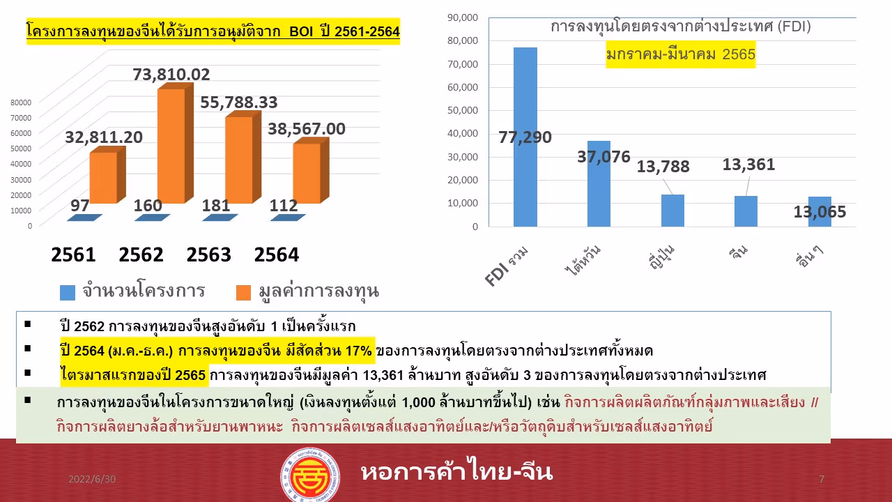ส่วนผลของการสอบถามความคิดเห็นด้านการลงทุนของจีนในไทย พบว่า ร้อยละ56 ของผู้ให้ข้อมูลคิดว่า การลงทุนจากจีนในไทยในไตรมาสที่ 3 เมื่อเปรียบเทียบกับไตรมาสที่ 2 จะเพิ่มขึ้นในขณะที่ร้อยละ 28 ของผู้ให้ข้อมูลคาดว่าการลงทุนจะไม่เปลี่ยนแปลงไปจากปัจจุบัน