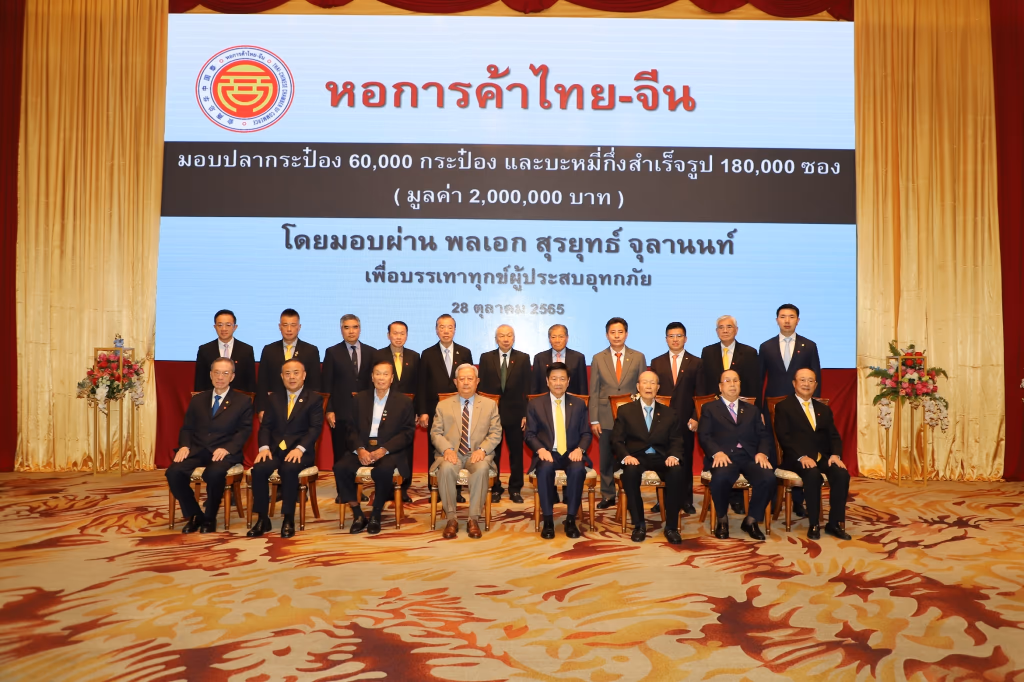 เมื่อวันที่ 28 ตุลาคม 2565 นายณรงค์ศักดิ์ พุทธพรมงคล ประธานกรรมการ หอการค้าไทย-จีน พร้อมด้วยคณะกรรมการบริหาร ให้การต้อนรับ พลเอกสุรยุทธ์ จุลานนท์ ประธานองคมนตรี ในพิธีการส่งมอบสิ่งของบริจาค เช่น ปลากระป๋อง 60,000 กระป๋อง และบะหมี่สำเร็จรูป 1,000 ลัง (180,000 ซอง) มูลค่าประมาณ 2 ล้านบาท เพื่อสนับสนุนการปฏิบัติงานบรรเทาทุกข์แก่ผู้ประสบอุทกภัย